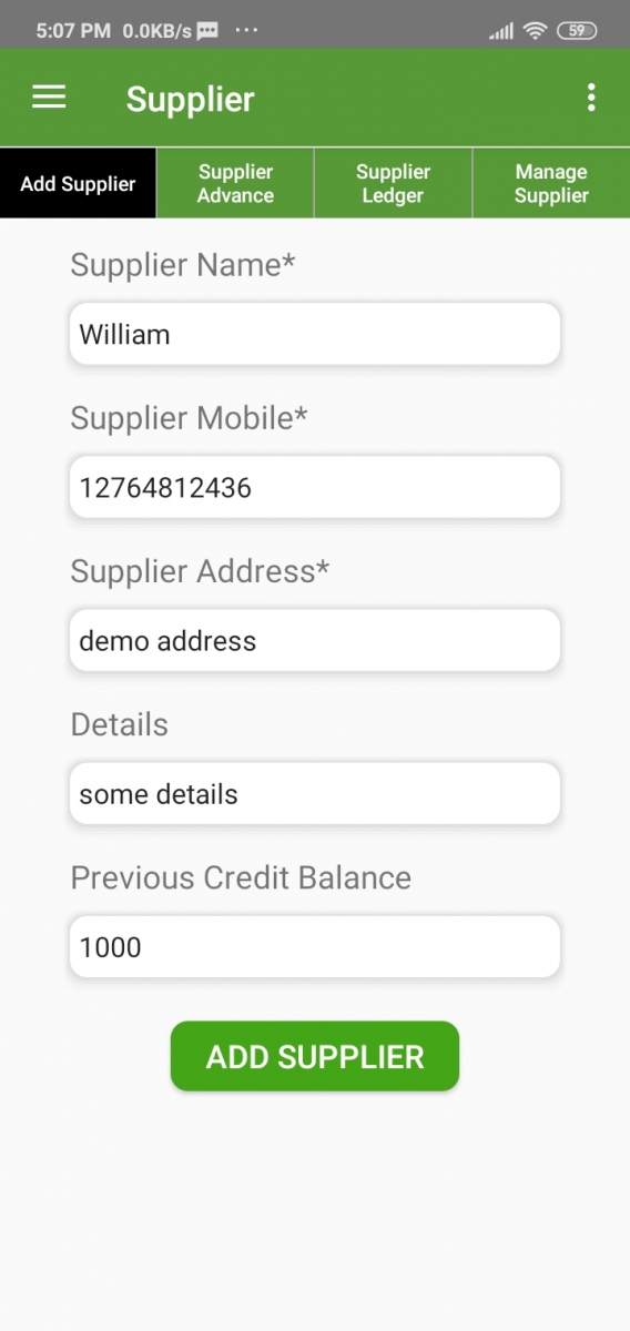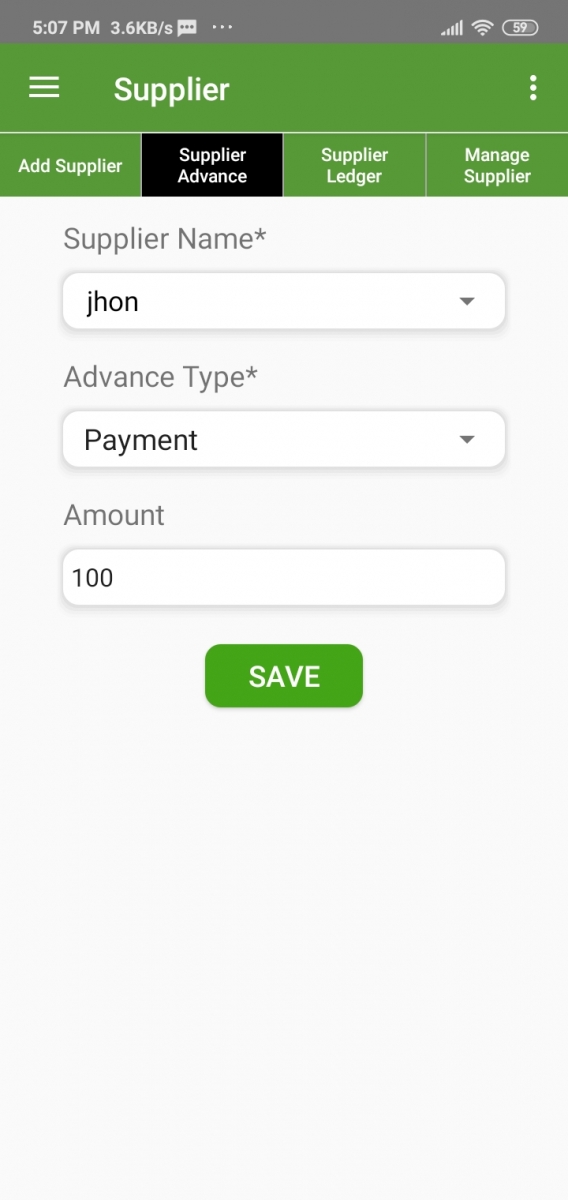 There is an option in this app, to make payment to a supplier. Just select Supplier, payment type, and Amount and click on the Save button.