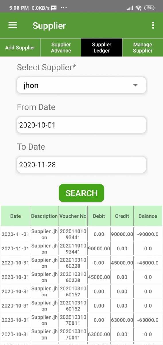Here you can check all the transactions of each Supplier date-wise. Just Select the Supplier and a date range hit the search button.