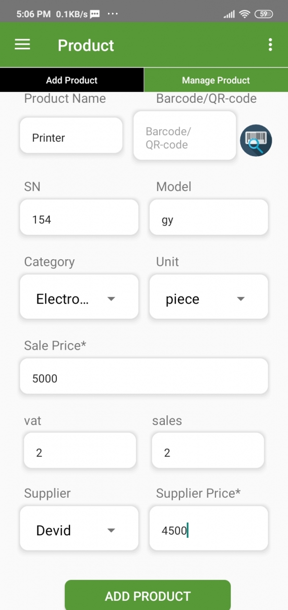 You can add products from this page. Insert all the required data. And hit the “Add Product” button. You can also add a bar code by clicking the barcode button.