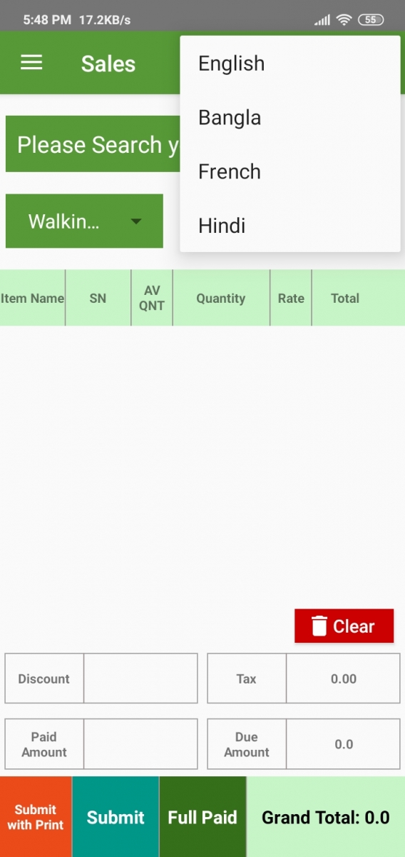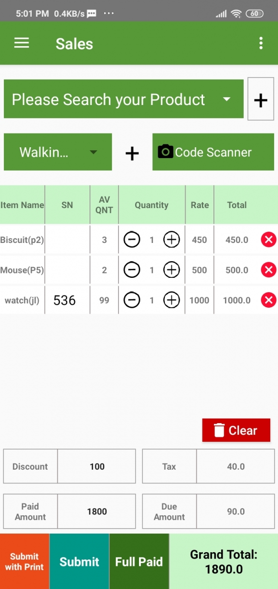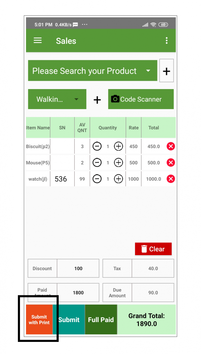 Here you can search or select your products by clicking the “+” button. Customer selection, discount, tax, everything on a single page. To print POS invoice just click the “Submit with print” button. Make sure your printer settings before you print.