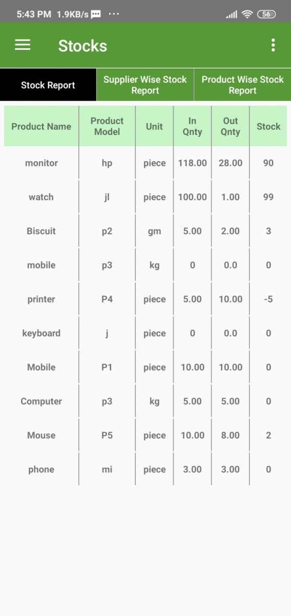 Here is all the product list with In Quantity, Out of Quantity, and a number of present stock.