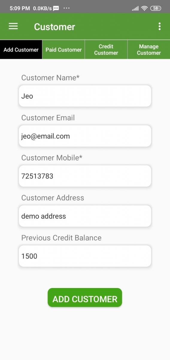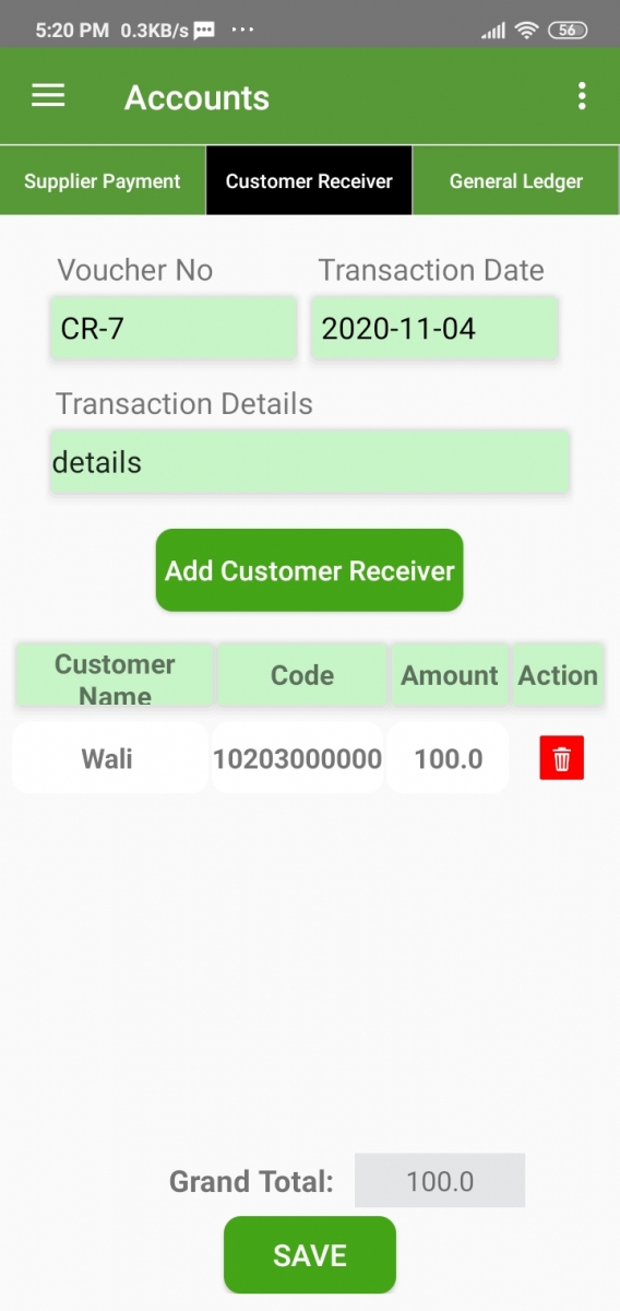 You can Add customer payment in this App. To add customer Payment just click on the “Add customer Receive” button. Then select customer, insert amount, and hit submit. Finally, click on the Save button.