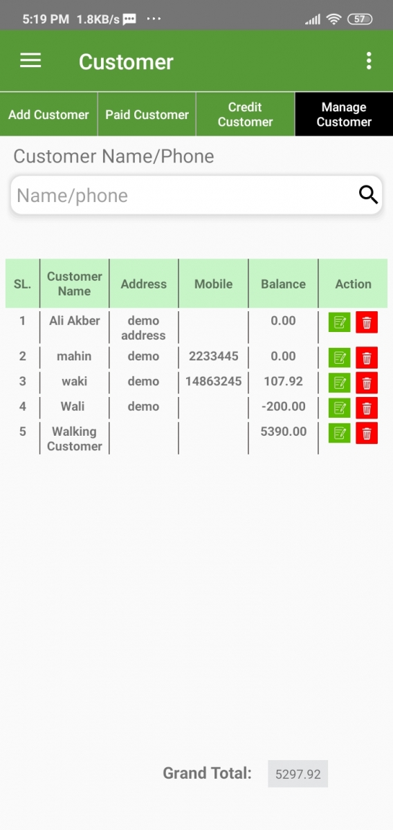 On this page, you will find all the customers with their details. You can also search your customers by Name/Phone.
