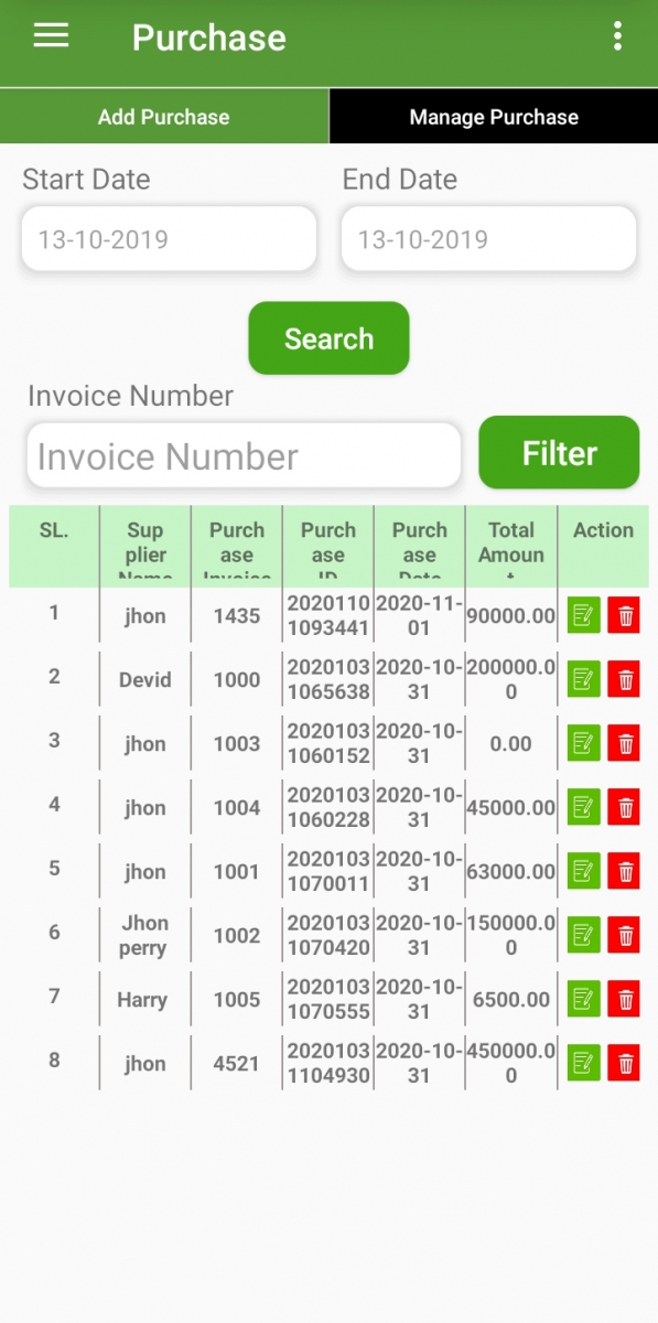 You will find the purchase list with details on this page. The purchase edits and deletes option also on this page. You can also filter your purchase record by invoice number and date.