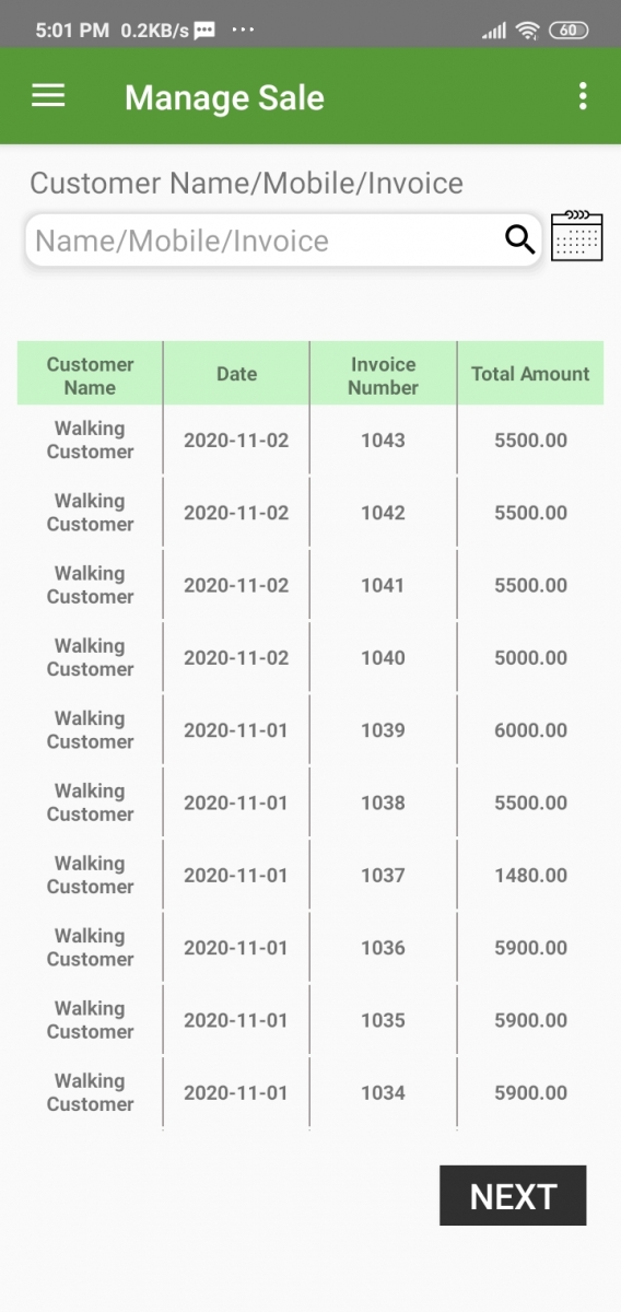 Here you can see all the invoices with the customer's name and date. In the search bar, you can search by Customer name, Invoice number, Mobile number. There is also an option to search date wise.