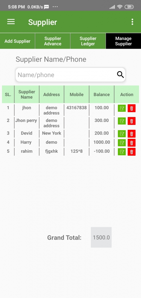 Here you will get all the suppliers with details. by searching their Name/phone. You can Update and Delete your list.