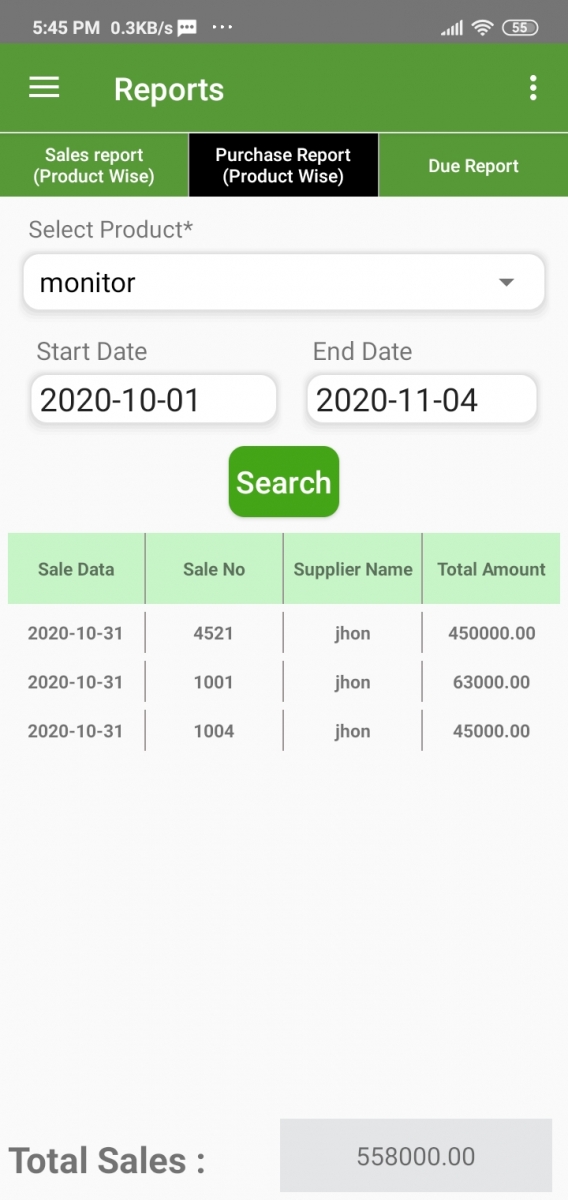 On this page, you will get the purchase report product-wise. Just select a product and date range. Click search.